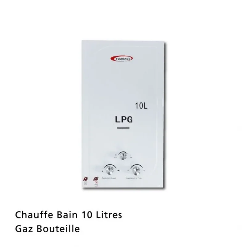 Nom de produit : Chauffe Bain 10 Litres Gaz Naturel Blanc Marque : Florence Débit d’eau Chaude : 10 L /par min Pression de gaz maximale :28 mbar Pression d’eau maximale : 0.2 bar Dimensions : 13 x 30 x 44 (L x l x H) cm Mode de fonctionnement :2 piles de type piles LR20 D (non fournie). Pays de fabrication : Chine Garantie : 1 an