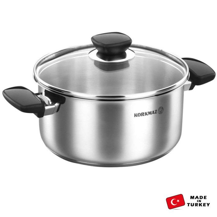 Faitout KORKMAZ KAPPA – Diamétre: 22 x 11 cm – Capacité: 4 Litres – Conception spéciale – Poignées et boutons ergonomiques en acier inoxydable au touche – La construction tri-plis se compose d’acier inoxydable durable encapsulant un noyau en aluminium pour un chauffage homogène – Surfaces extérieures soigneusement polies Compatible avec tous feux y compris induction – Facile à nettoyer – Couleur: Inox