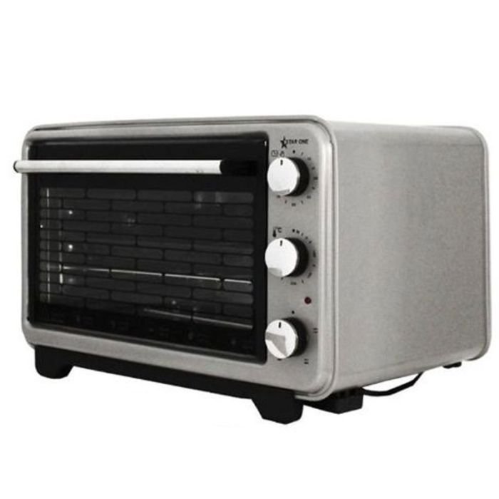 Four Électrique STAR ONE – Volume: 36 Litres – Puissance: 1420 Watts – Un plateau rectangulaire – Un plateau rond – Résistance à la forme de chrome – Façade en Métal – Minuterie réglable avec alarme et fonction d’arrêt automatique – Contrôle de chaleur – Couleur: Silver – Garantie 1 an