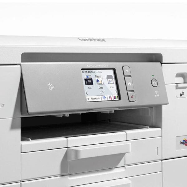 Imprimante jet d’encre Brother MFC-J4540DW Couleur – Fonction: Imprimer, Copier, Numériser et télécopie – Technologie d’impression: Jet d’encre – Format Papier: A4 – Ecran couleur tactile de 6,8 cm – Mémoire: Interne (128 Mo) – Vitesse d’impression(Noir,Couleur) : recto A4 Mono: 20 (images par minute) – recto-verso A4 Mono: 11 (images par minute) , recto A4 Couleur: 19 (images par minute) – recto-verso A4 Couleur: 10 (images par minute) – Résolution impression: Jusqu’à 1 200 x 4 800 dpi – Chargeur automatique de documents de 20 feuilles – Impression recto/verso: Automatique – Connectivité: USB, WiFi – Dimensions: 435 x 372 x 250 mm  – Poids: 10,4 kg  Garantie: 1 an