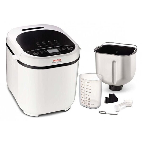 Machine à pain Tefal – Puissance 720 W – Nombre de programmes : 12 – Capacité : min 500 g / max: 1 Kg – Ecran LCD – Tasse et cuillère-mesure – Minuterie, départ différé – Dimensions: 36 x 36 x 35 cm – Poids: 998 g – Couleur : Blanc – Garantie : 1 an