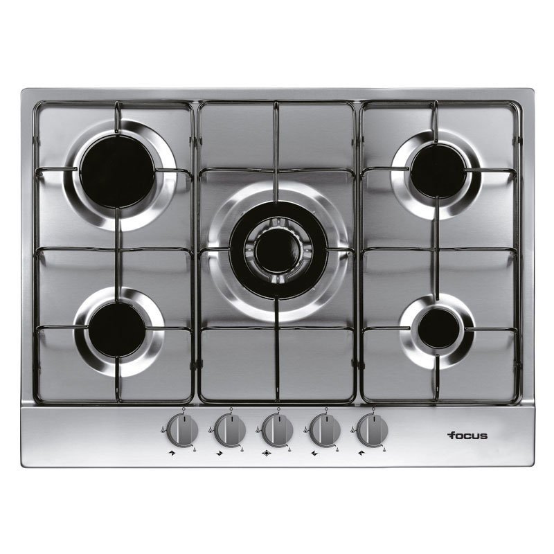 Plaque de Cuisson Encastrable FOCUS – Type de Plaque: à Gaz – Largeur: 70 cm – Nombre de Foyers: 5 Foyers, dont un brûleur à triple couronne – Flamme Stabilisée – Grilles et chapeaux de brûleurs émaillées – Commandes Frontales – Allumage Automatique – Dimenions: 690 x 520 x 51 mm – Couleur: Inox – Garantie: 2 ans