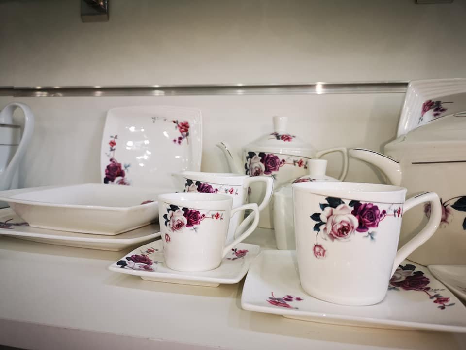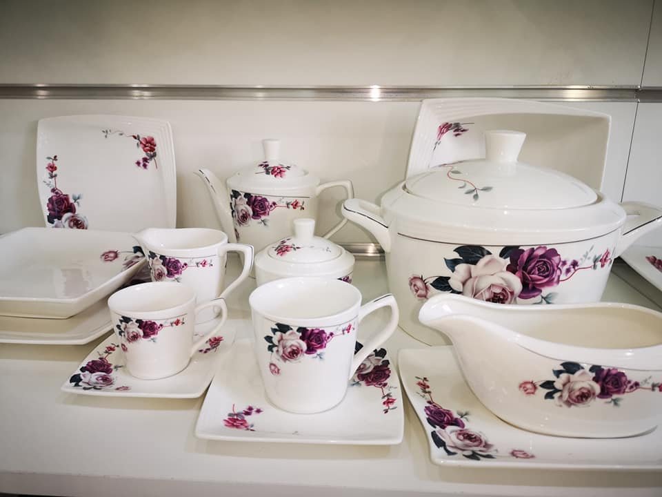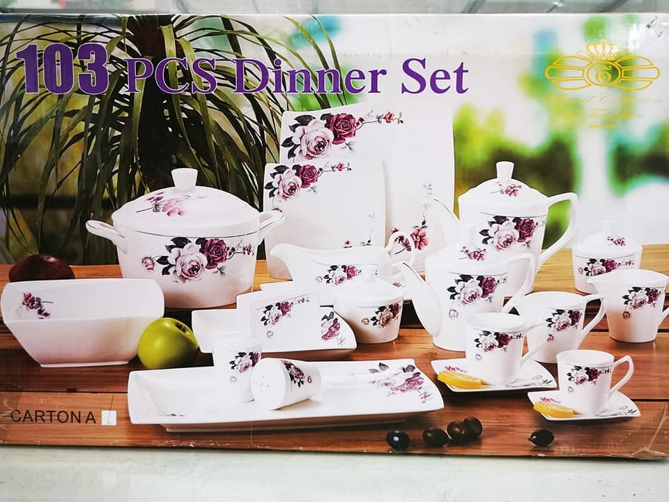 Service À Table 103 Pièces En Céramique : 12 assiettes de dîner 10.5″ – 12 assiettes à soupe 8.5″ – 12 assiettes plates 7.5″ – 12 Tasses à thé avec 12 Sous Tasses à thé – 12 Tasses à café avec 12 Sous Tasses à café – 2 Soupière avec 2 couvercles – 2 théières avec 2 couvercles – 2 pots de sucre avec 2 Couvercles – 2 Crémières – 1 saladier 9″ – 1 Plat ovale 12″ – 1 Saucière avec 1 Plateau – 1 Porte-serviettes – 1 salière – 1 poivrière – Couleur: Blanc