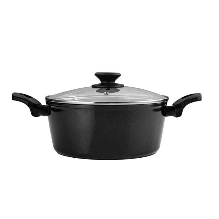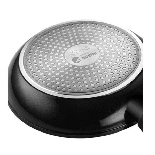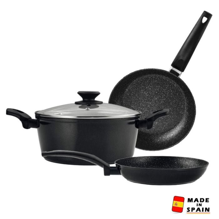 Set De Cuisine FAGOR VIVANT – Marmite: Diamètre: 24 cm – Capacité: 4,8 Litres – Couvercle de Marmite: en verre de 24 cm – Poêle: Diamètre: 24 cm – Capacité: 2,1 Litres – Poêle: Diamètre: 20 cm – Capacité: 1,3 Litres – Matière: Aluminium forgé – Epaisseur: 3 mm – Intérieur antiadhésif à deux couches avec effet de pierre – Poignées ergonomiques en bakélite – Couvercle en verre résistant à la chaleur avec évacuation des vapeurs et bord en acier inoxydable – Garde-flamme peint en noir – Fond spécial d’induction – Grande durabilité.Batterie de cuisine compatible avec tout type de plaque dont celles à induction – Couleur: Noir