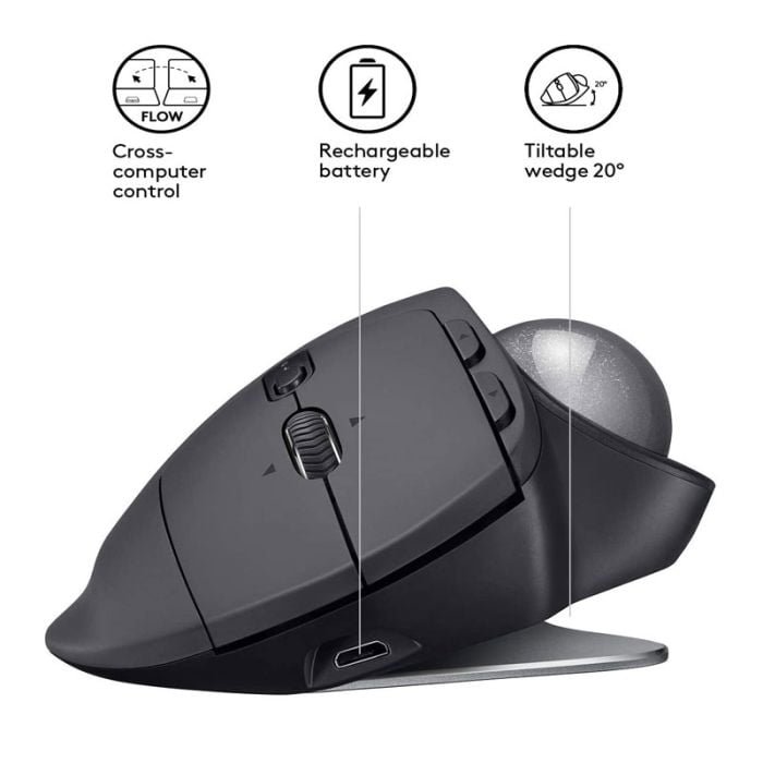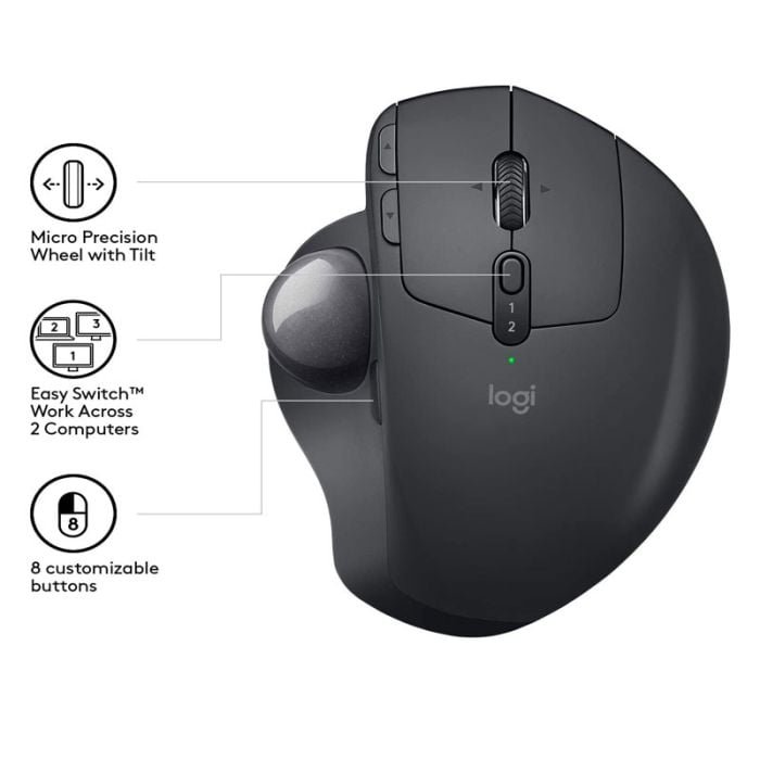 Souris LOGITECH MX Ergo Trackball – Technologie de connectivité: Sans Fil (Bluetooth) – Interface: USB – Distance de fonctionnement: 10 mètres – Résolution Optique: 2048 dpi – Nombre de boutons: 8 – Batterie: LiPo, 500 mAh – Autonomie de la batterie: Jusqu’à 4 mois sur une seule charge complète – PPP réglable – Angle d’inclinaison réglable – Balle facile à retirer – Couleur: Noir – Garantie: 1 an